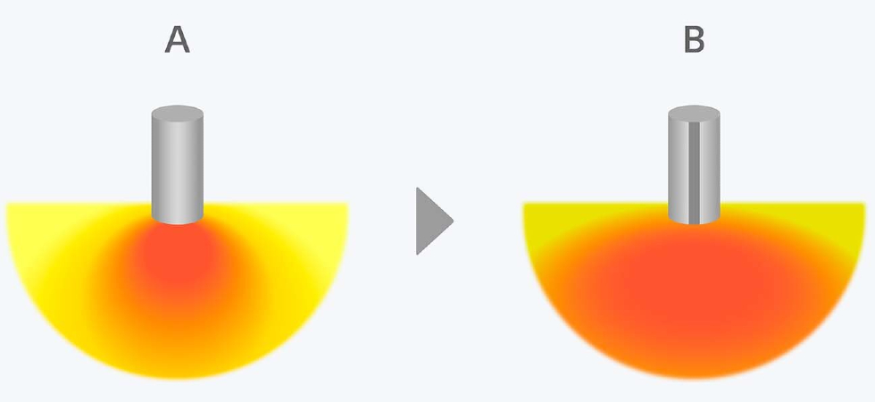 Завдяки лінійному дифузору звук у зоні перед колонкою поширюється далі, тому якість звуку буде стабільна спереду та з боків від колонки. Це означає, що кожна людина в приміщенні може танцювати під ту саму музику з однаковою якістю. A = звичайна зона покриття; B = ширша зона покриття з лінійним дифузором